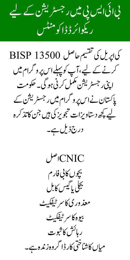 To receive the April disbursement of BISP 13500, you must first complete your registration in this program. The Government of Pakistan has prescribed some documents for registration in this program, which are mentioned below:
