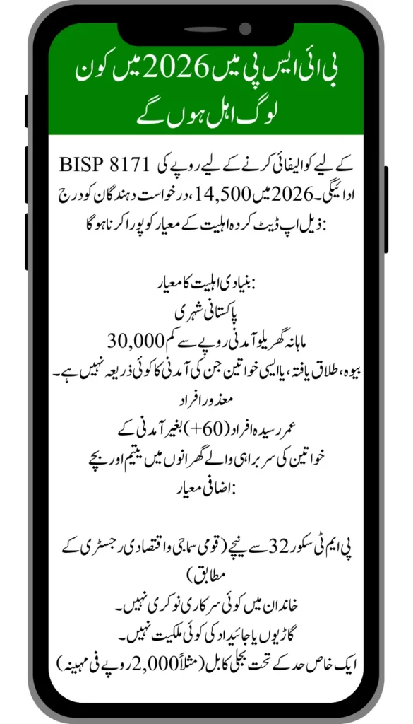 To qualify for the BISP 8171 payment of Rs. 14,500 in 2026, applicants must meet the following updated eligibility criteria: