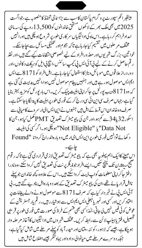BISP August 2025 Payment Update: The Benazir Income Support Programme continues to serve as Pakistan’s largest social protection initiative, providing quarterly financial assistance to millions of low-income families. As of August 2025, a new wave of updates has been issued for beneficiaries regarding the Rs. 13,500 payment, online eligibility status, and improvements in the verification process.