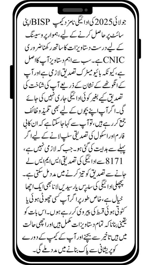 To receive your BISP July 2025 payment at the designated campsite, it’s essential to carry the correct documents for smooth processing. The most important document is your original CNIC, as biometric verification is mandatory and no payment will be issued without confirming your identity through your thumbprint. If you’re also collecting Taleemi Wazaif for your children, you may be asked to bring their B-Form and a school verification slip if previously instructed.