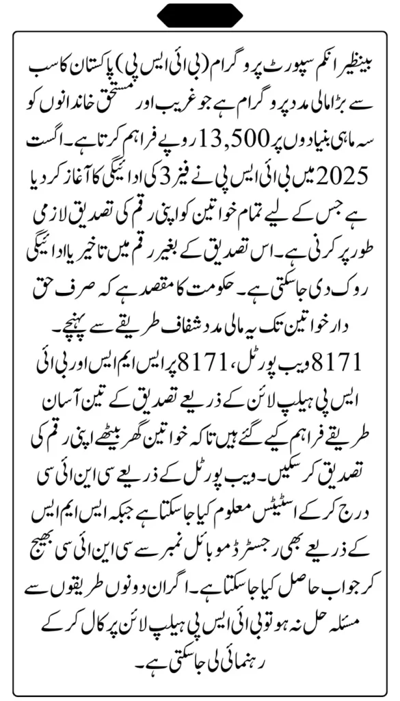 The BISP 8171 Phase 3 payment cycle for August 2025 has now started, and this time, the government has made payment verification mandatory for all beneficiaries. Eligible women must confirm their status before collecting the quarterly Rs. 13,500 amount to avoid delays or disqualification.