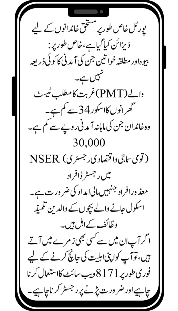 The 8171 ویب پورٹل is an official platform introduced by the Benazir Income Support Programme and the Government of Pakistan. It is designed to: