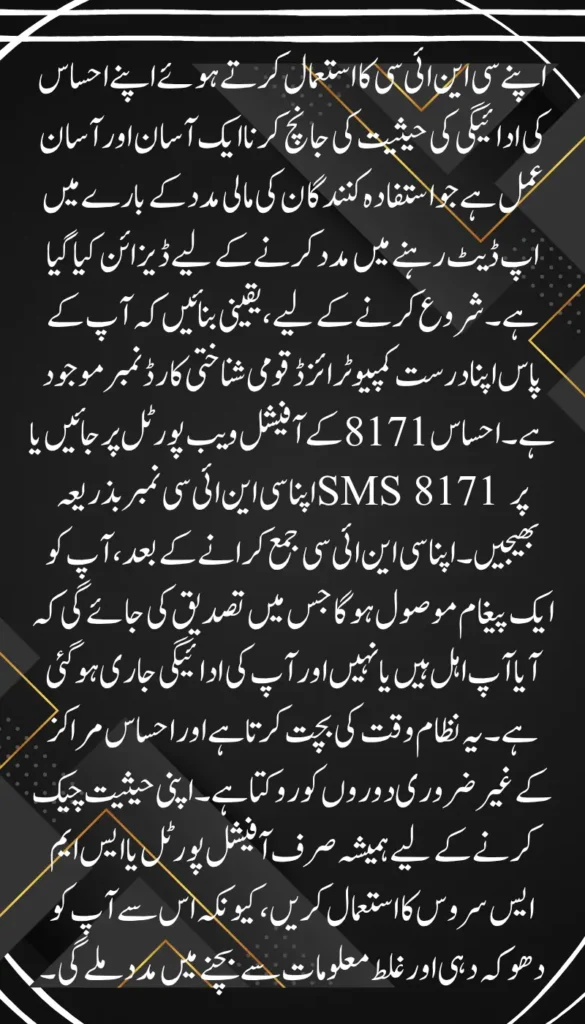 Checking your Ehsaas payment status using your CNIC is a simple and convenient process designed to help beneficiaries stay updated about their financial support. To begin, make sure you have your valid Computerized National Identity Card number with you. Visit the official Ehsaas 8171 web portal or send your CNIC number via SMS to 8171. Once you submit your CNIC, you’ll receive a message confirming whether you are eligible and if your payment has been released. This system saves time and prevents unnecessary visits to Ehsaas centers. Always use only the official portal or SMS service to check your status, as this will help you avoid scams and misinformation.